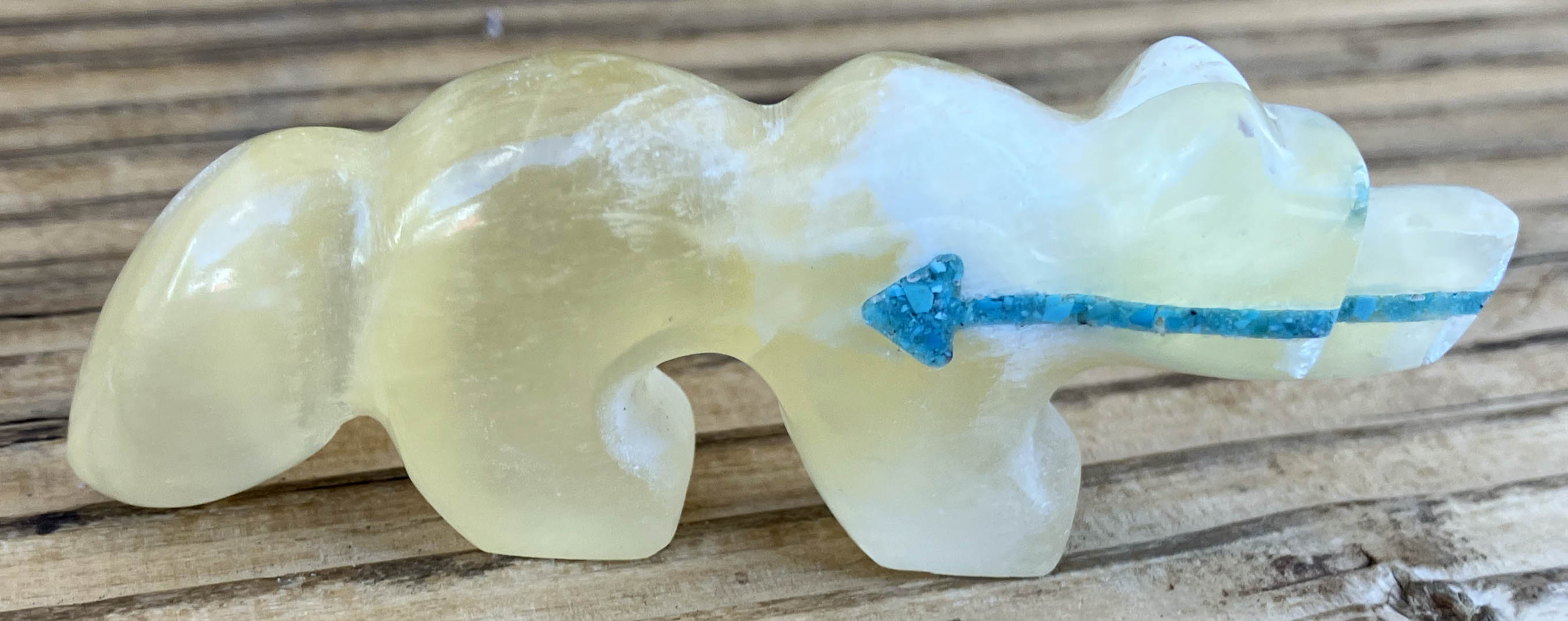 " Wolf Fetish with Turquoise Heartline and Eyes from Calcite Fluorite"